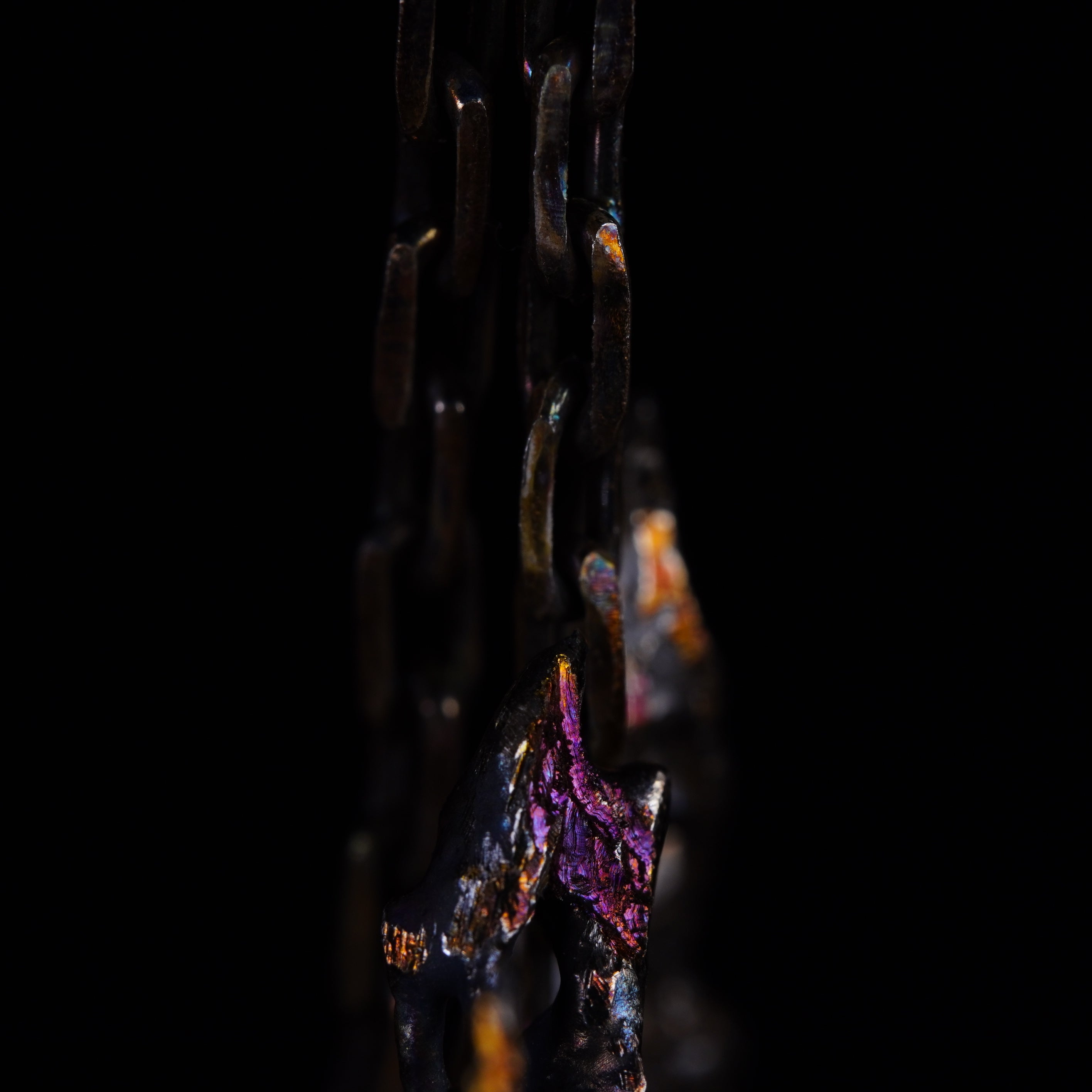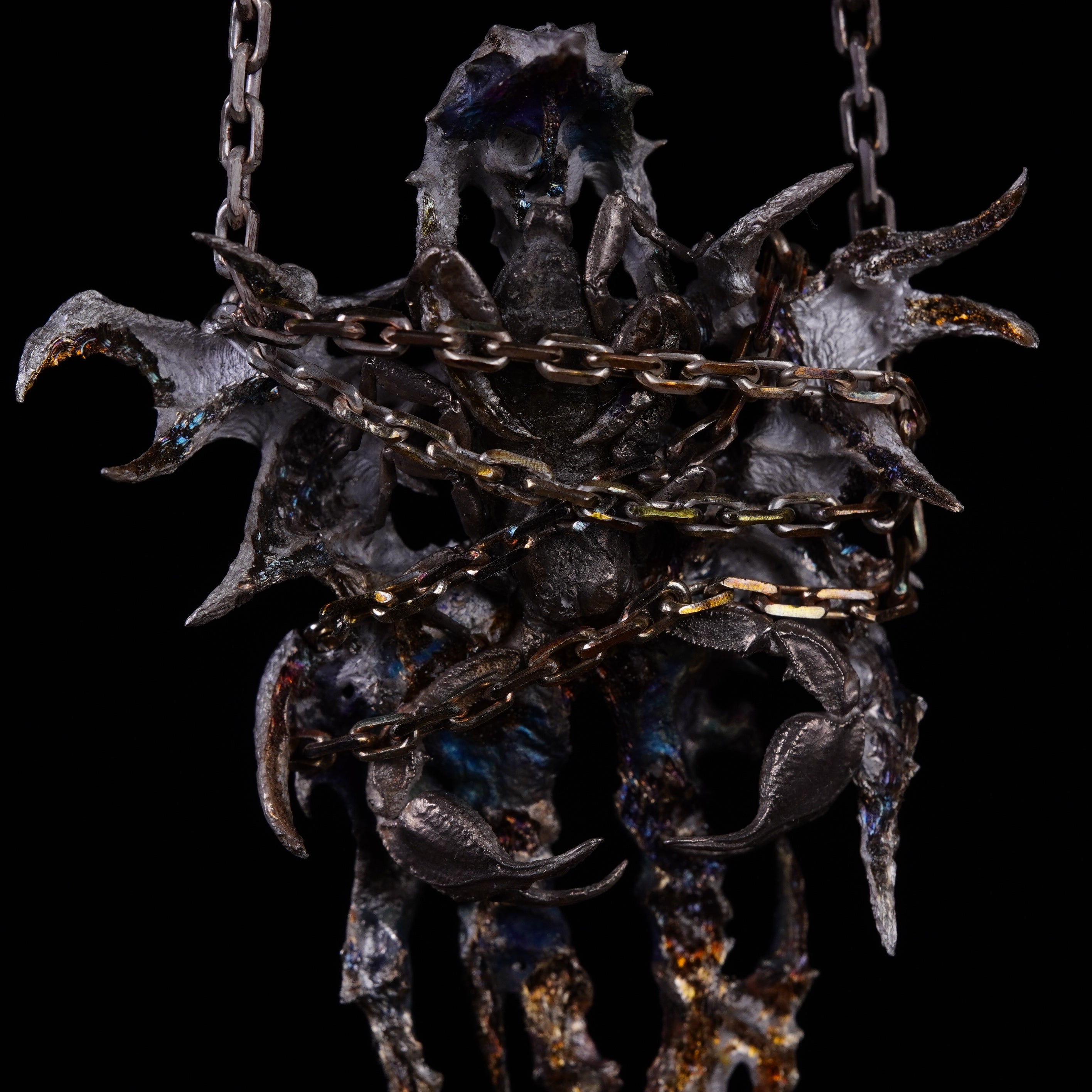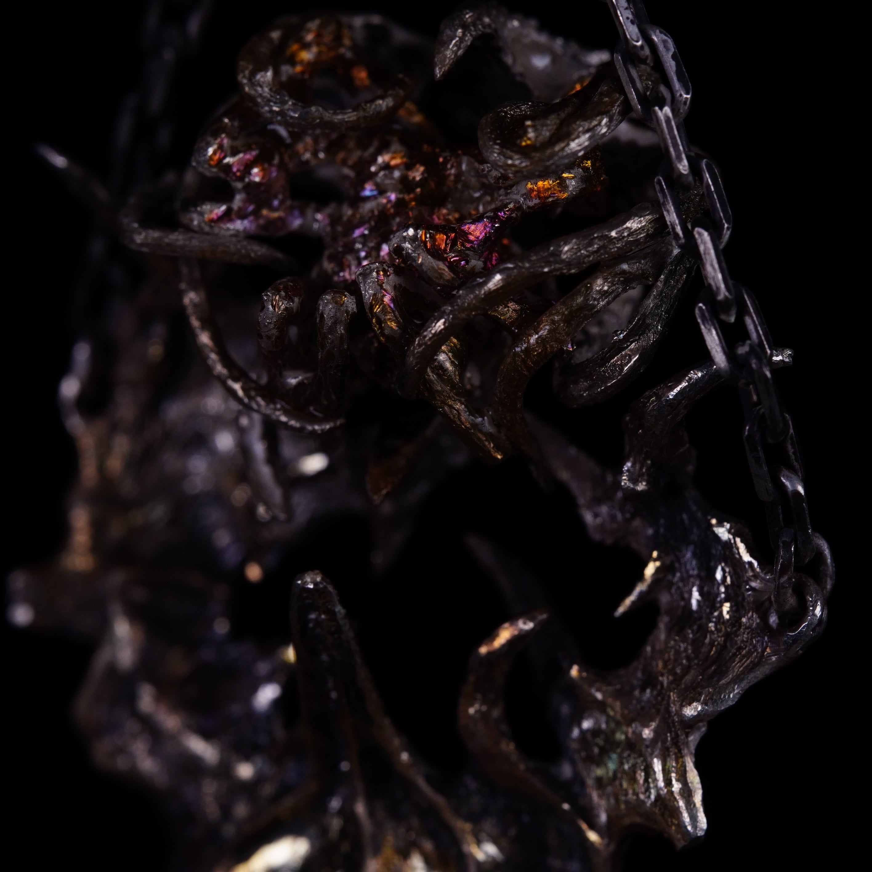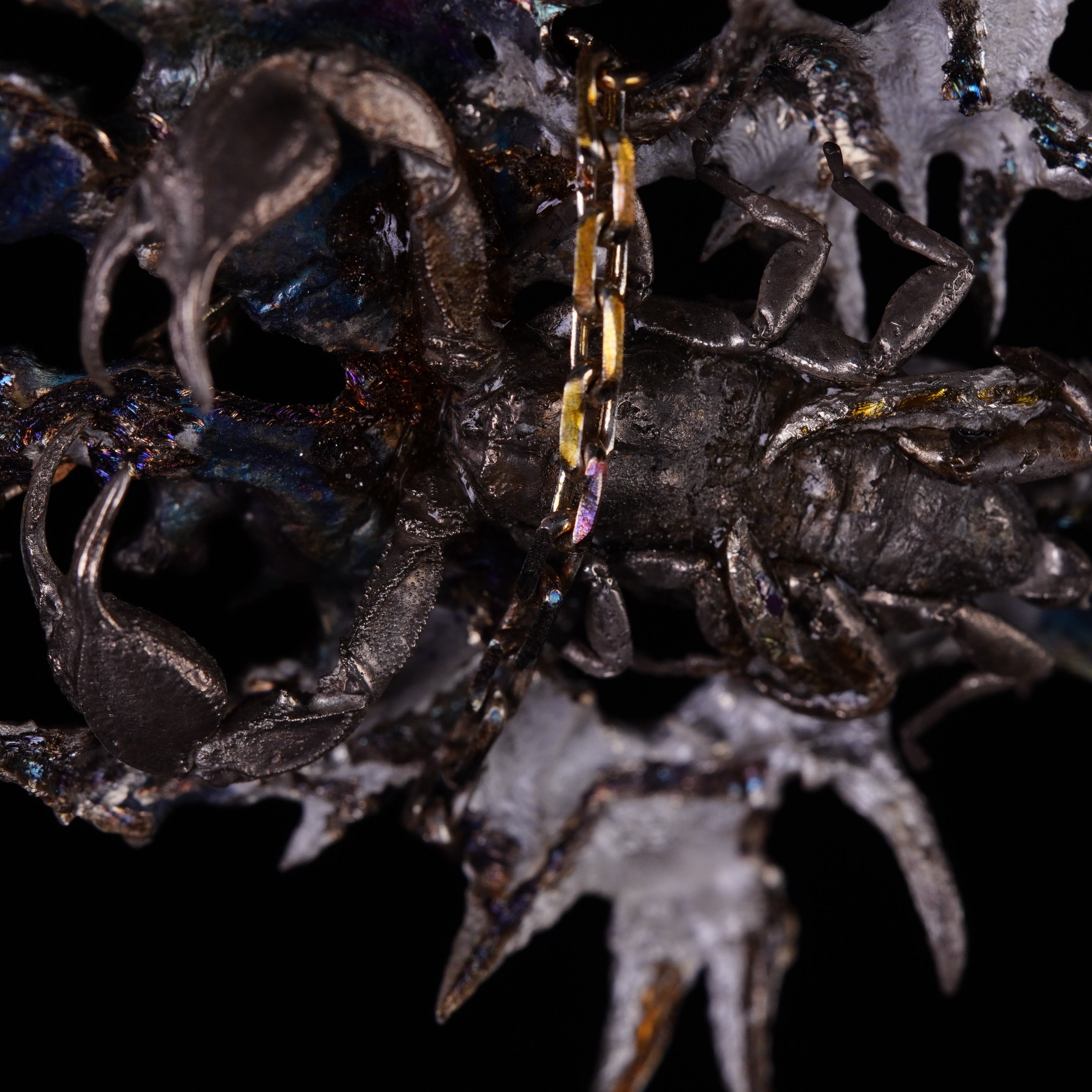 Hints of peculiar living creatures emerge, arthropods and arachnids, their limbs thin and intertwined. Wrapped in magical shades and iridescent reflections, their sinuous, sharpened tips guard the origin of existence itself.