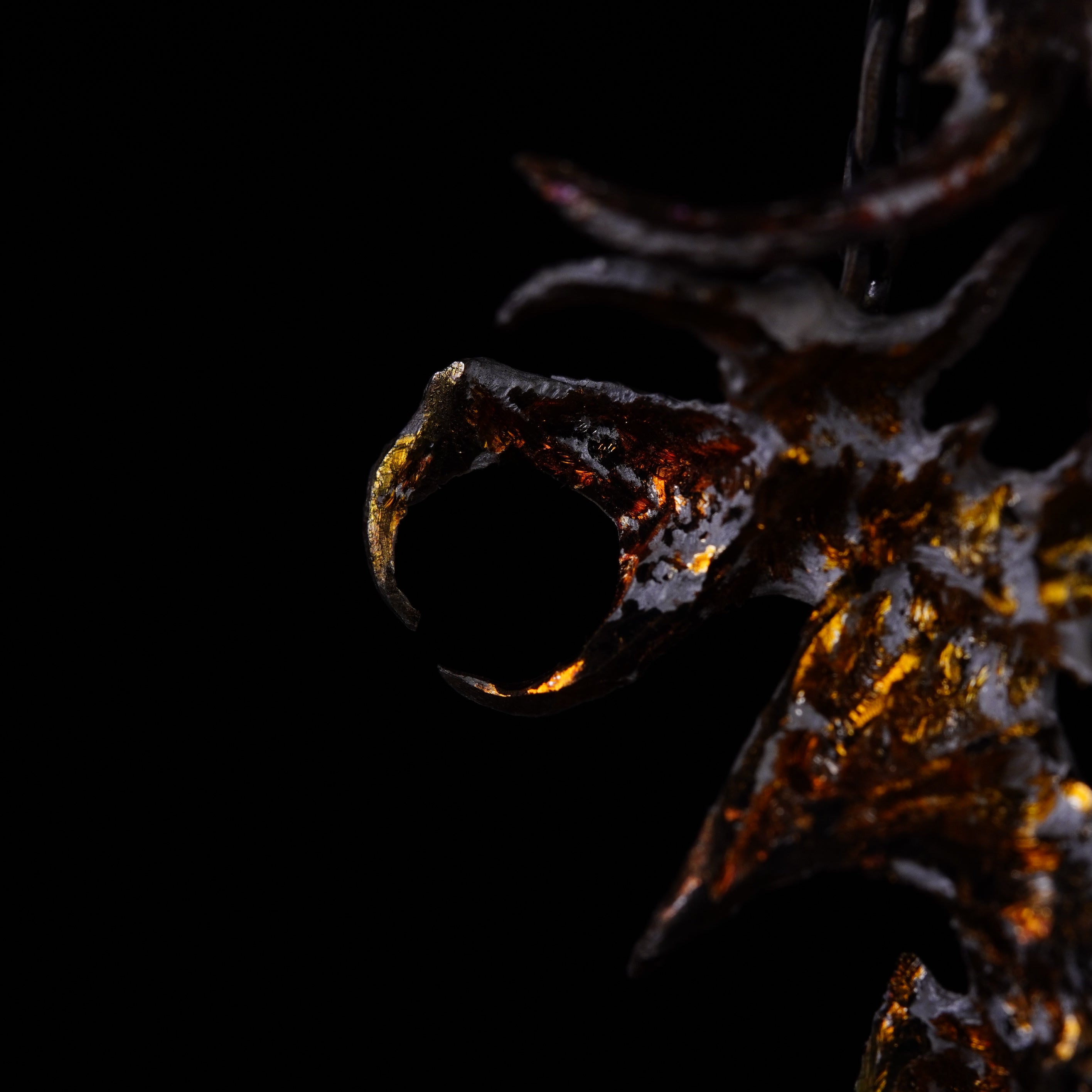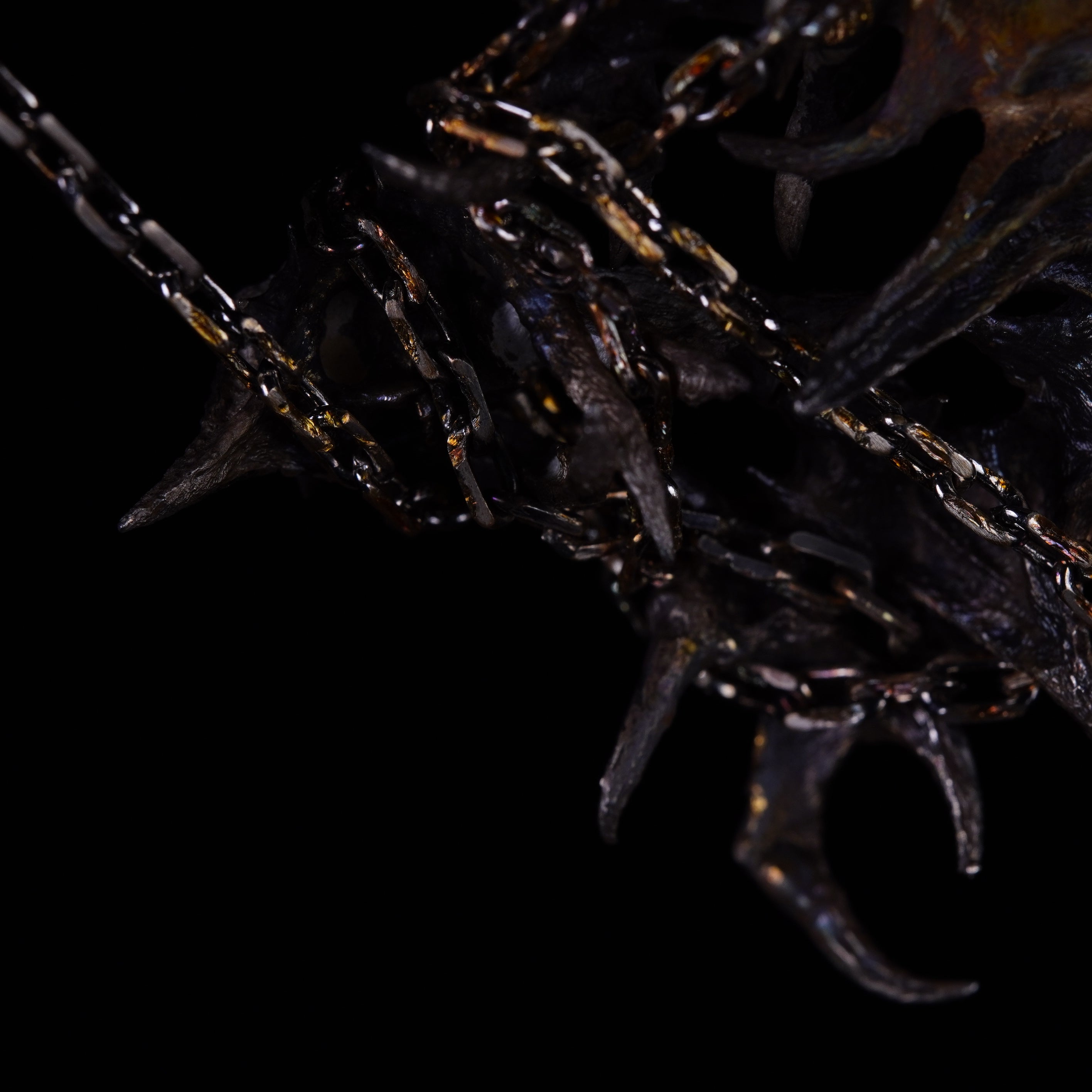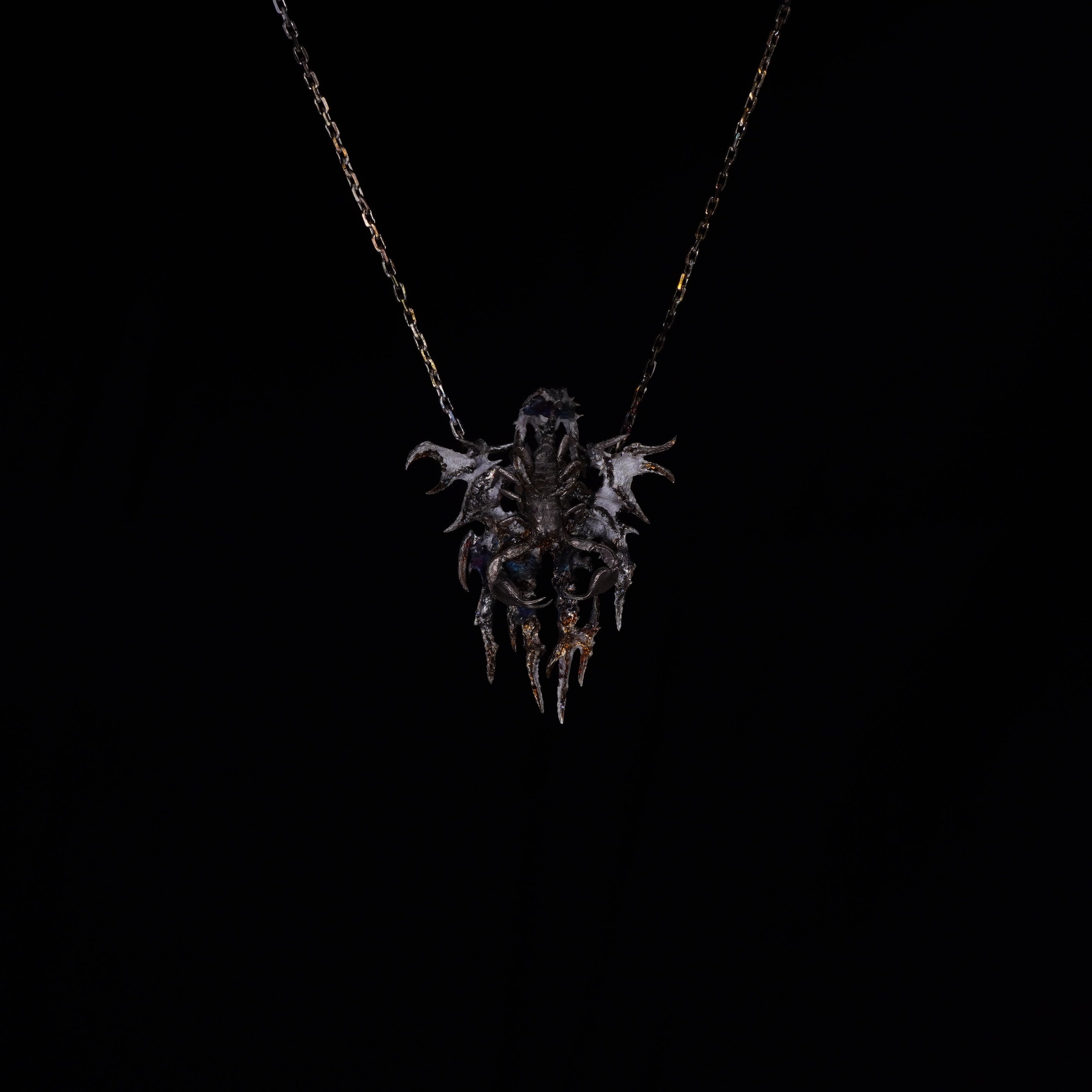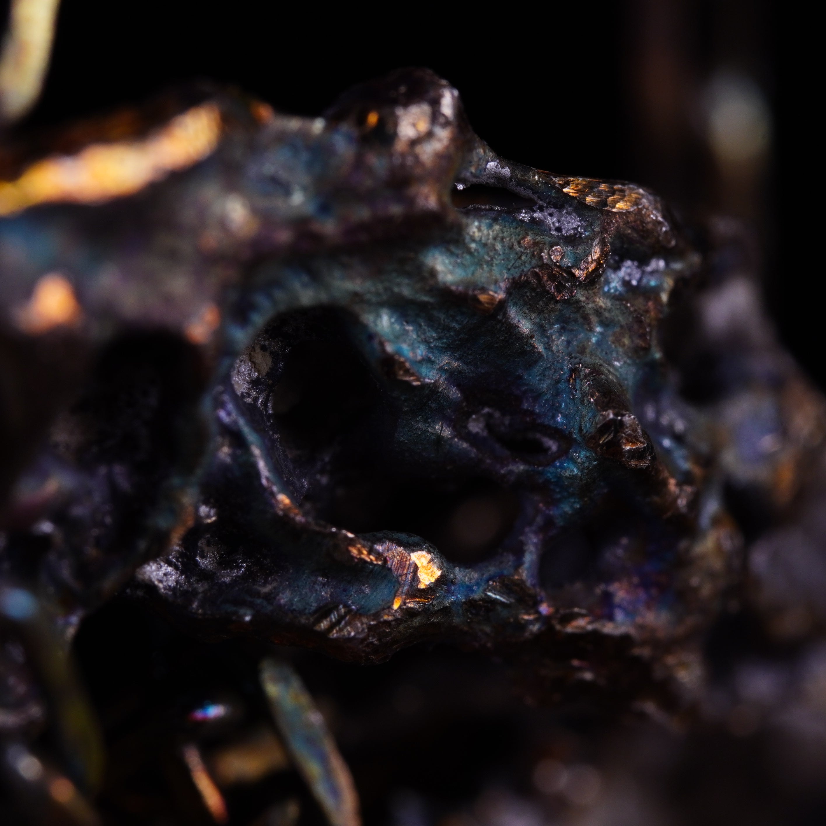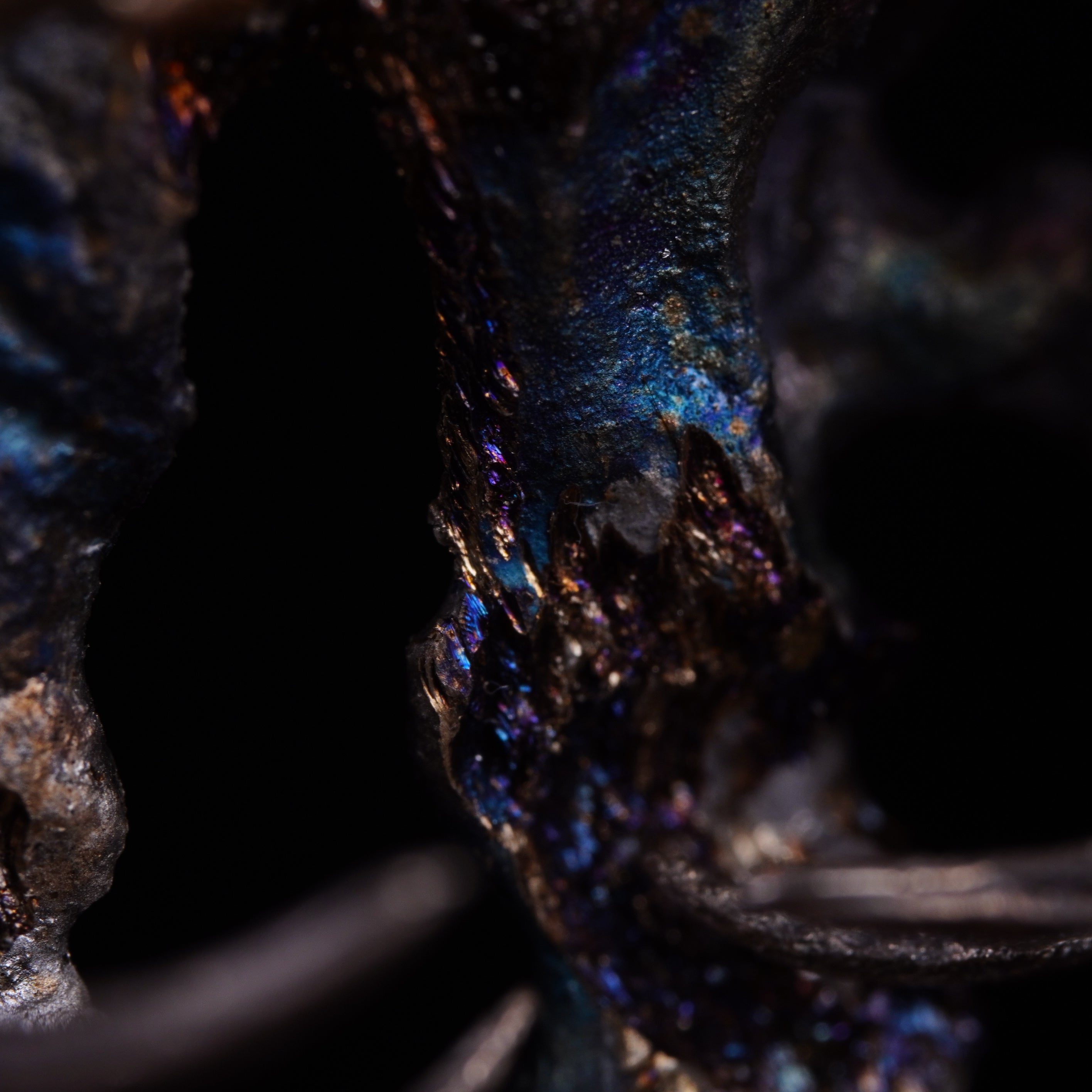 Hints of peculiar living creatures emerge, arthropods and arachnids, their limbs thin and intertwined. Wrapped in magical shades and iridescent reflections, their sinuous, sharpened tips guard the origin of existence itself.