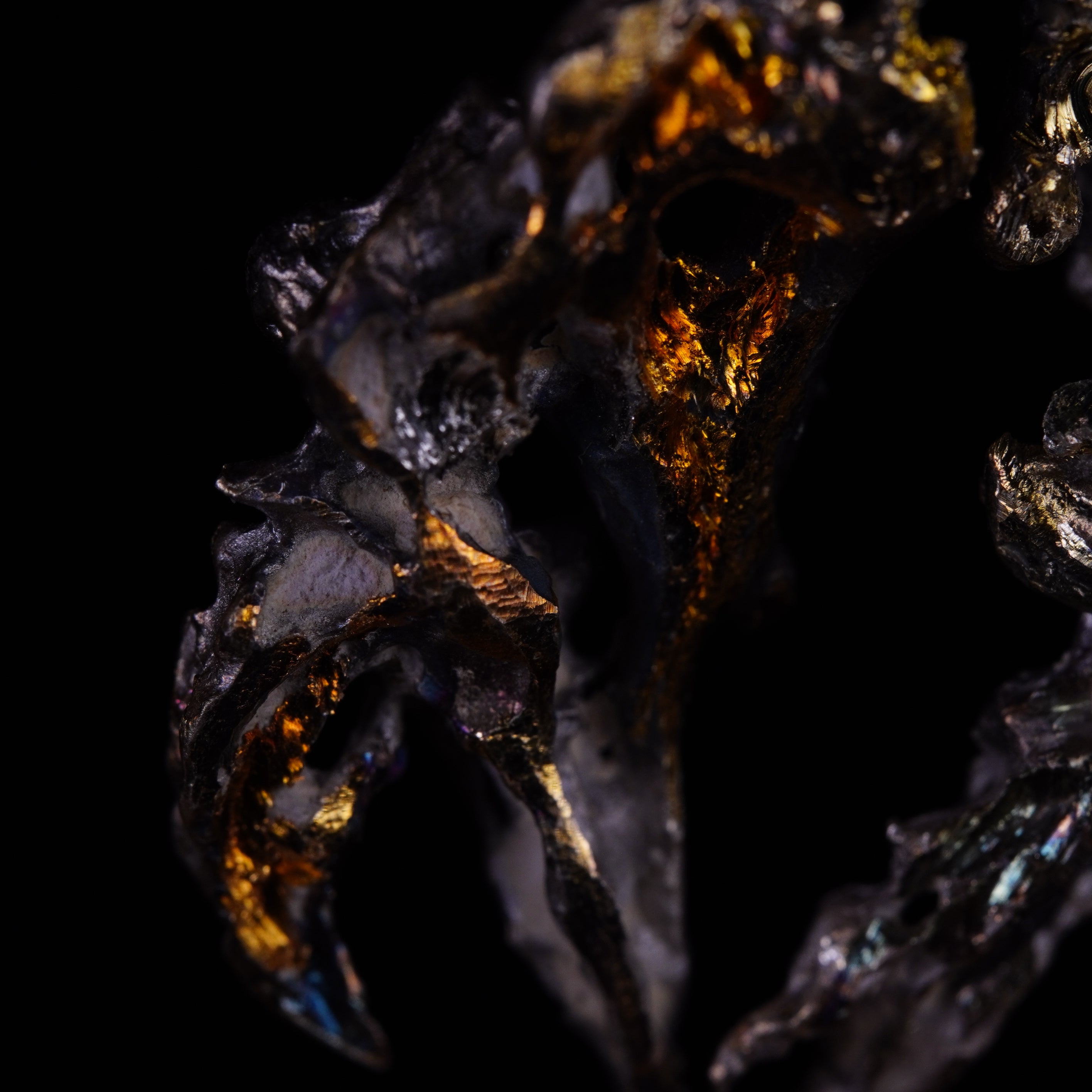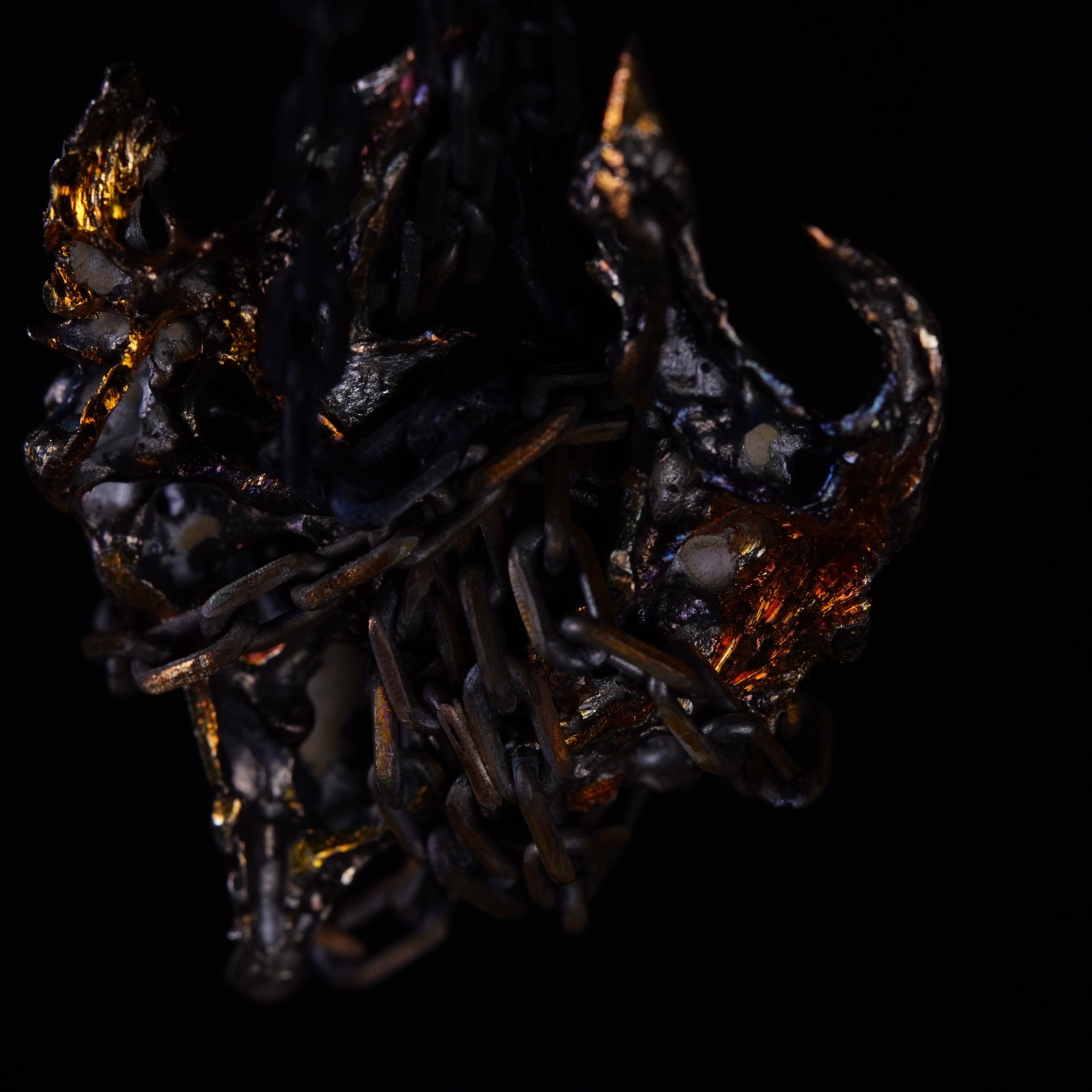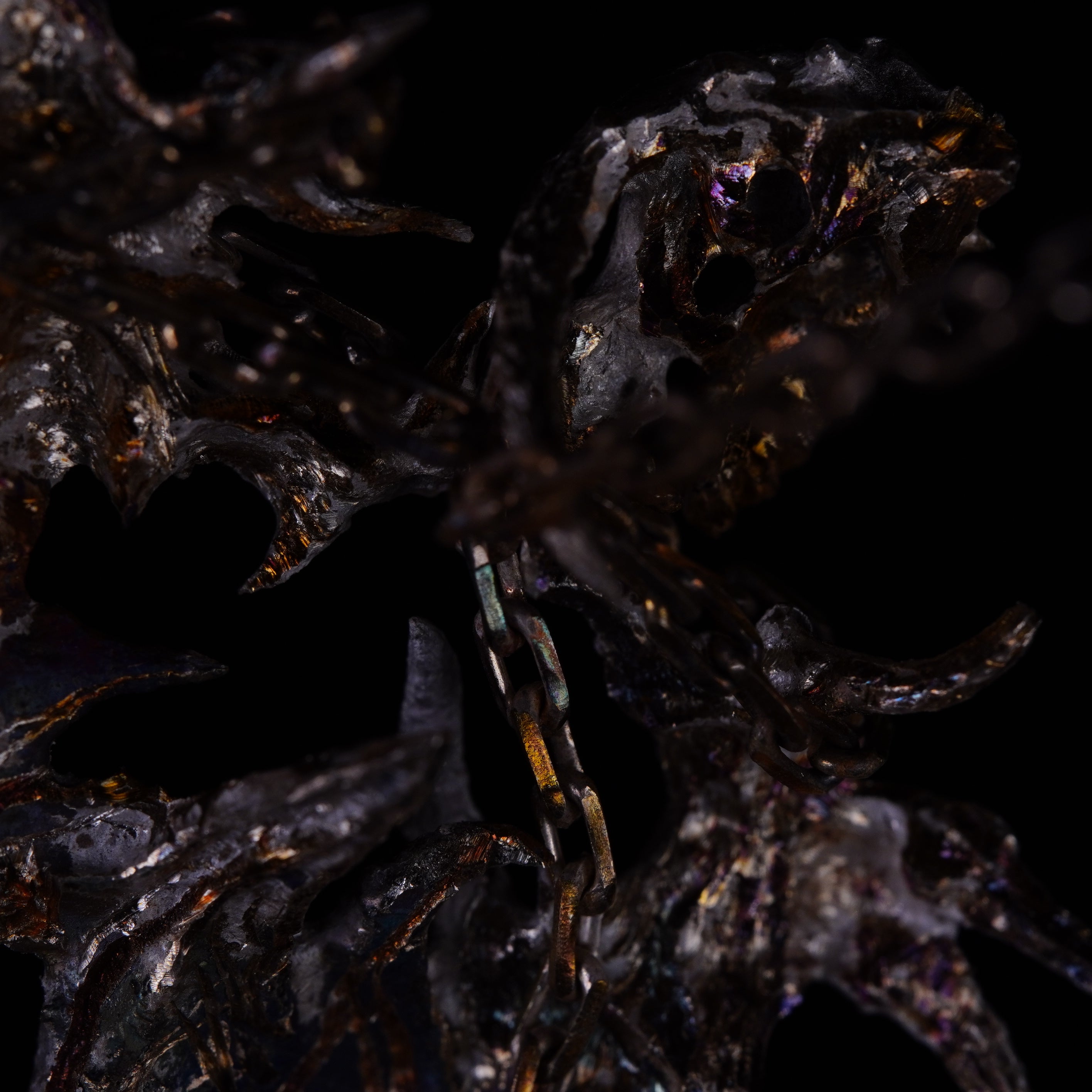 RADIX: small, refined, chaotic entanglements with arcane hues, fragments of unknown universes. Violet reflections, golden surfaces, and greenish craters form rough textures that shape these dark guardians.