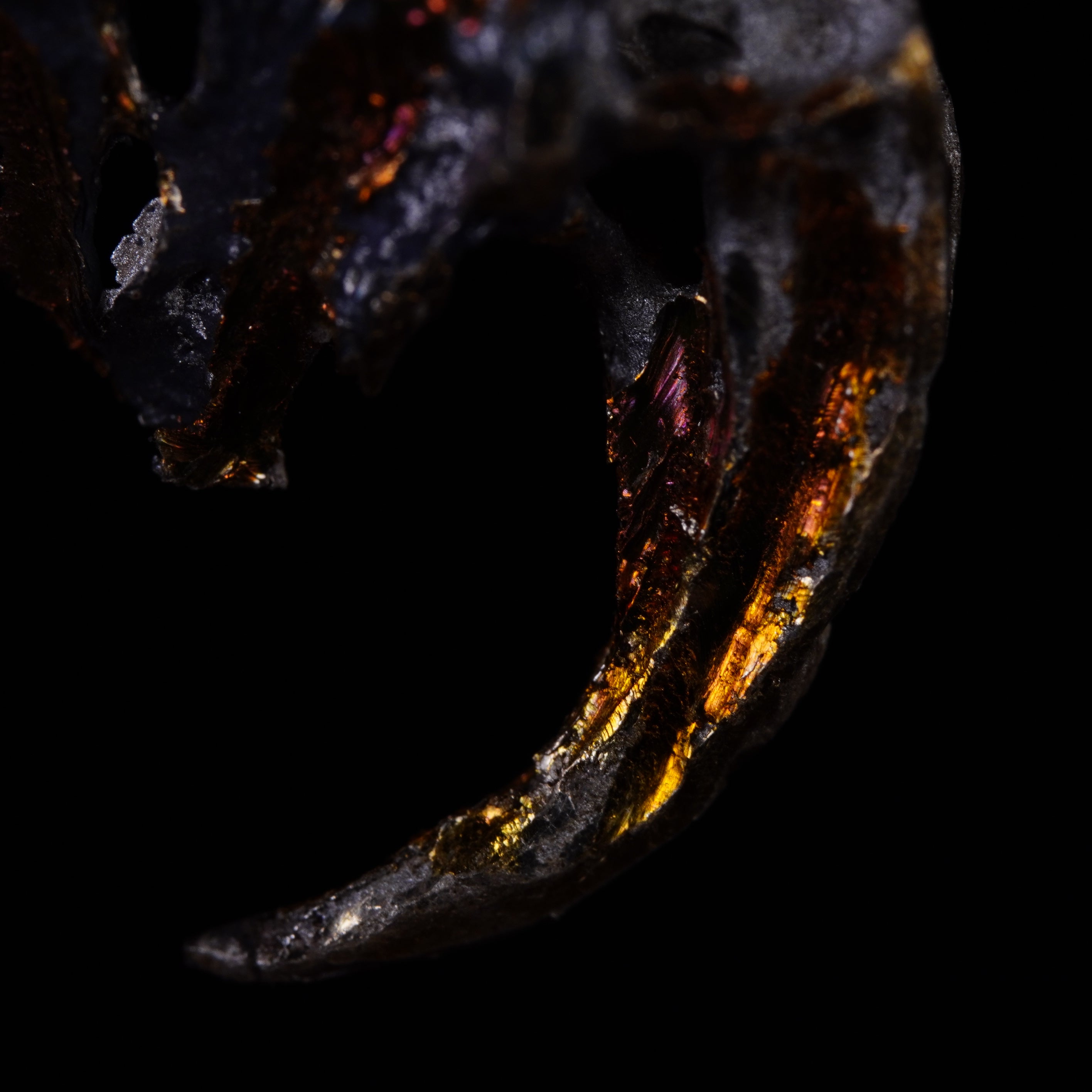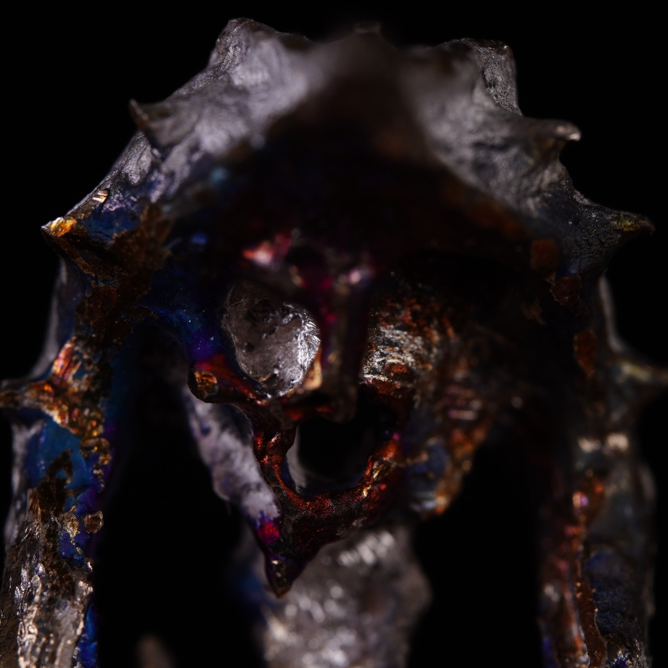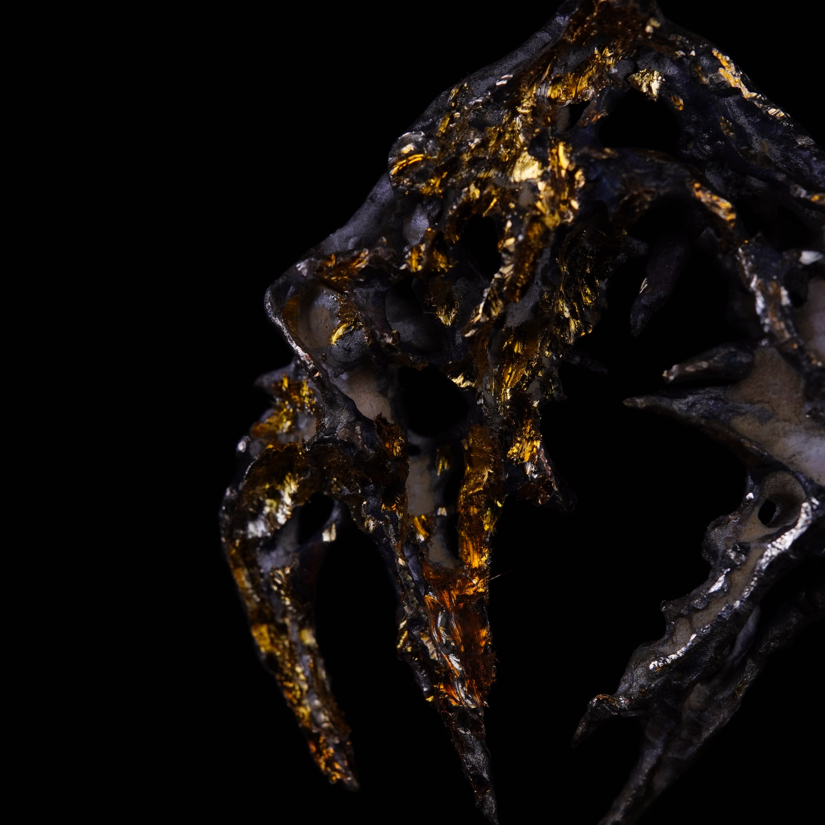 RADIX: small, refined, chaotic entanglements with arcane hues, fragments of unknown universes. Violet reflections, golden surfaces, and greenish craters form rough textures that shape these dark guardians.
