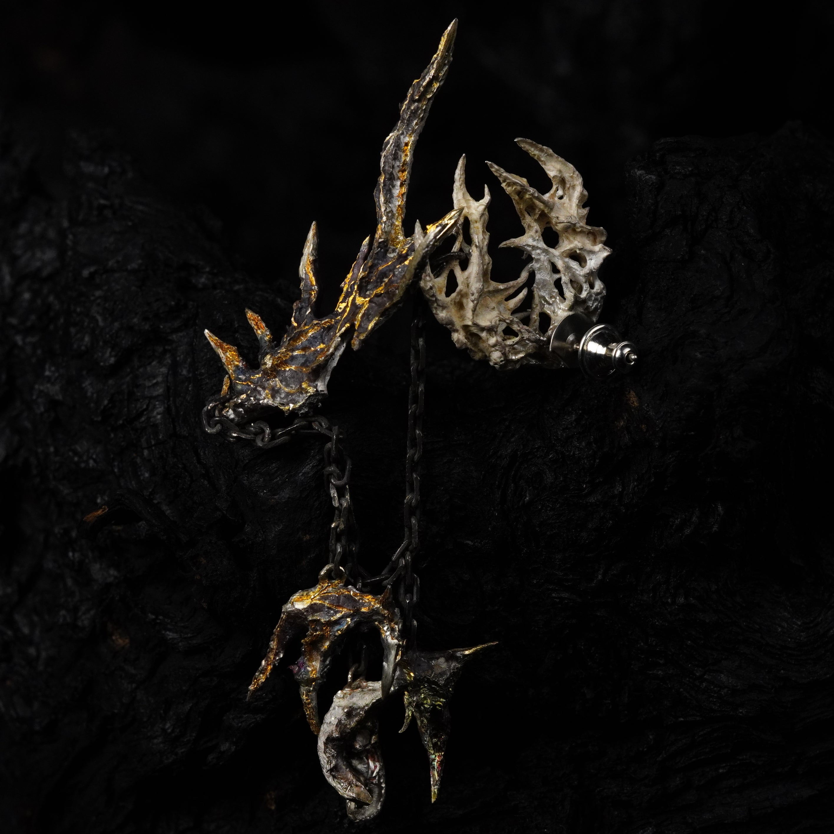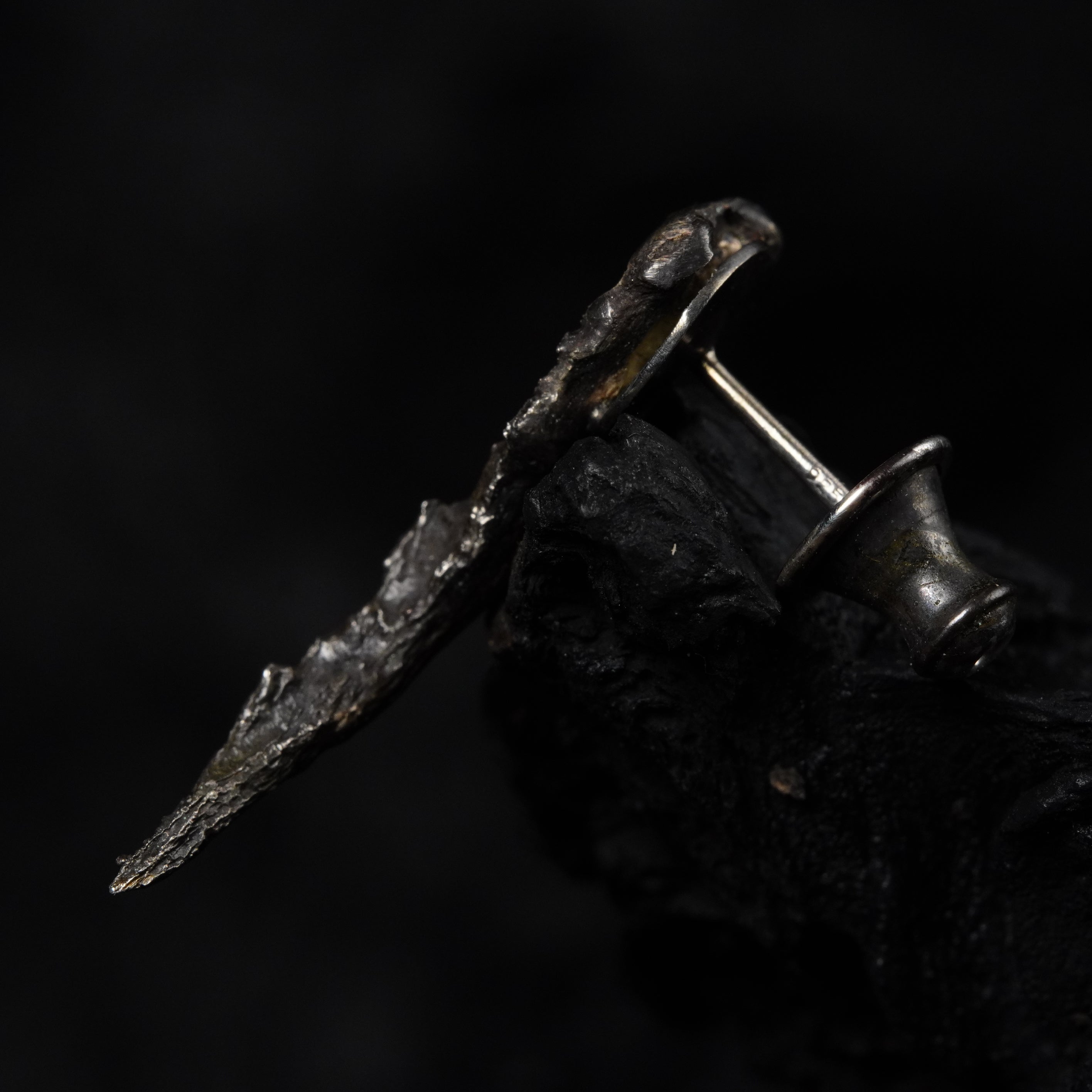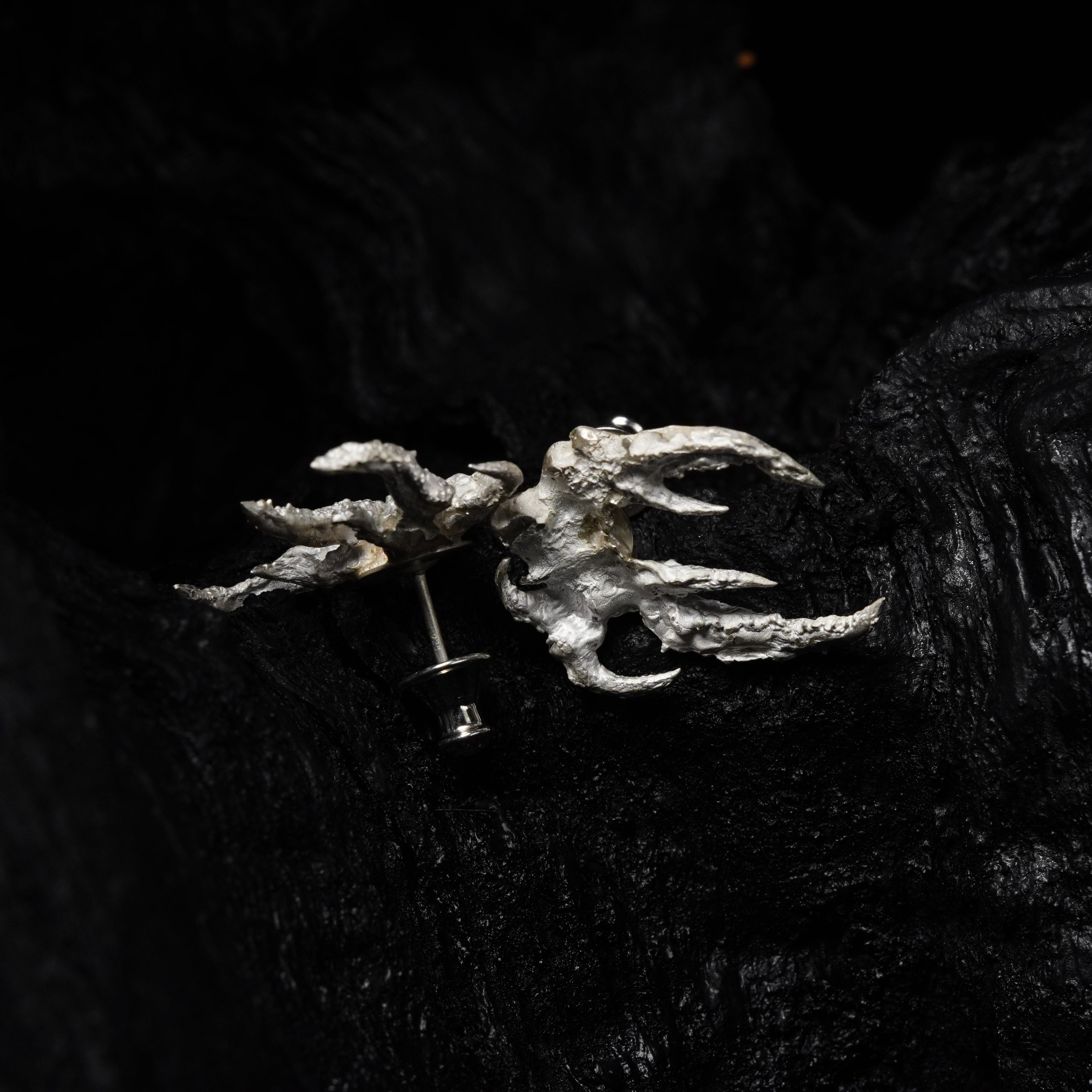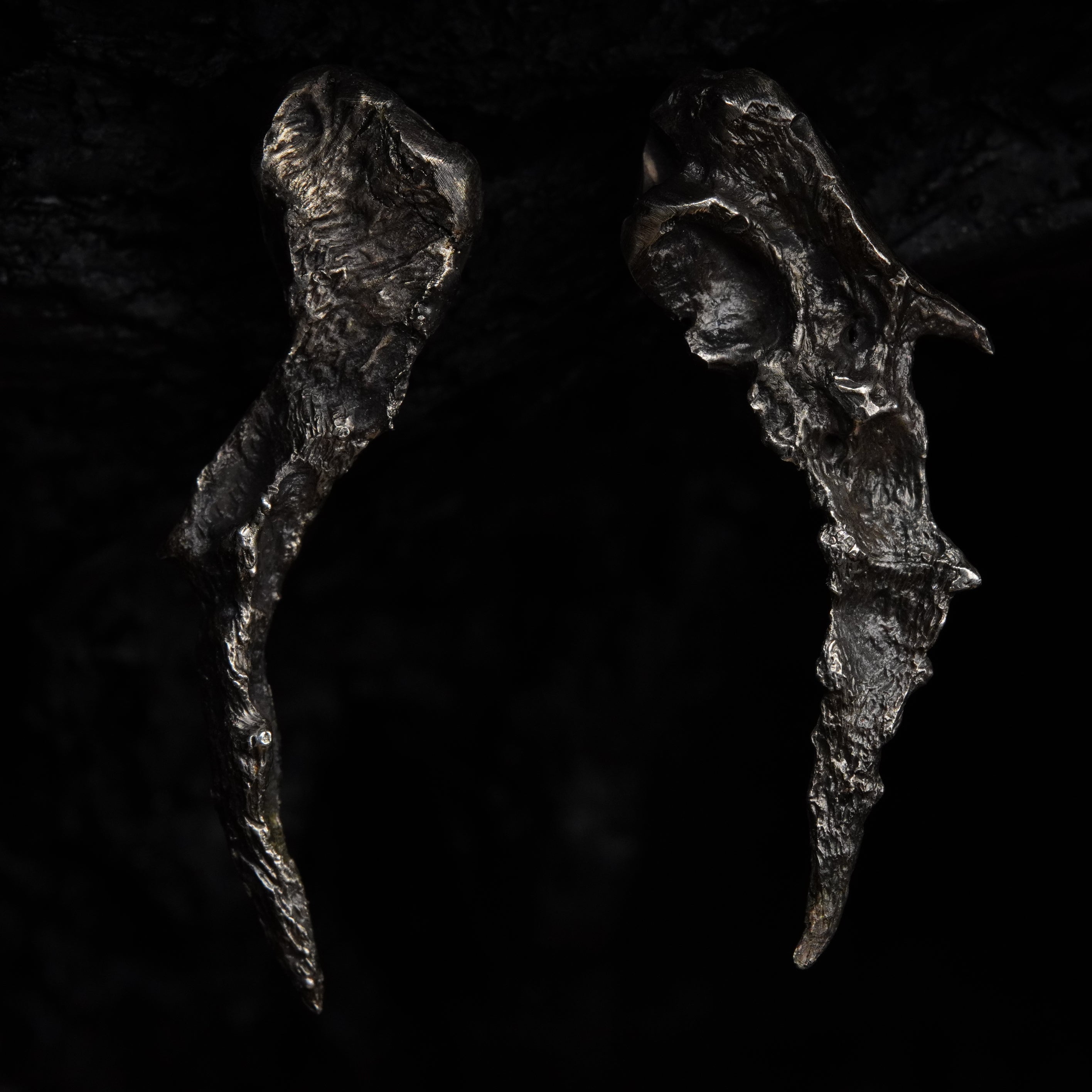BOTRUS: born as two distinct presences forced to align, the cluster earrings reveal their totality as a visceral spasm, the surrounding void overwhelms the gaze and reveals the mystery of their essence.